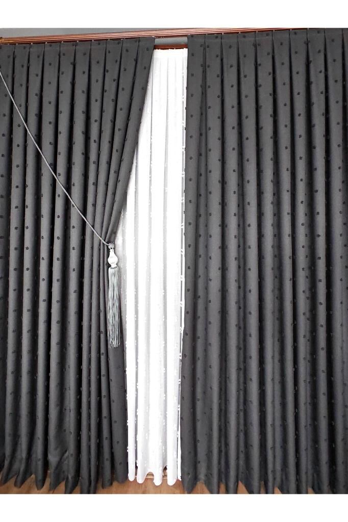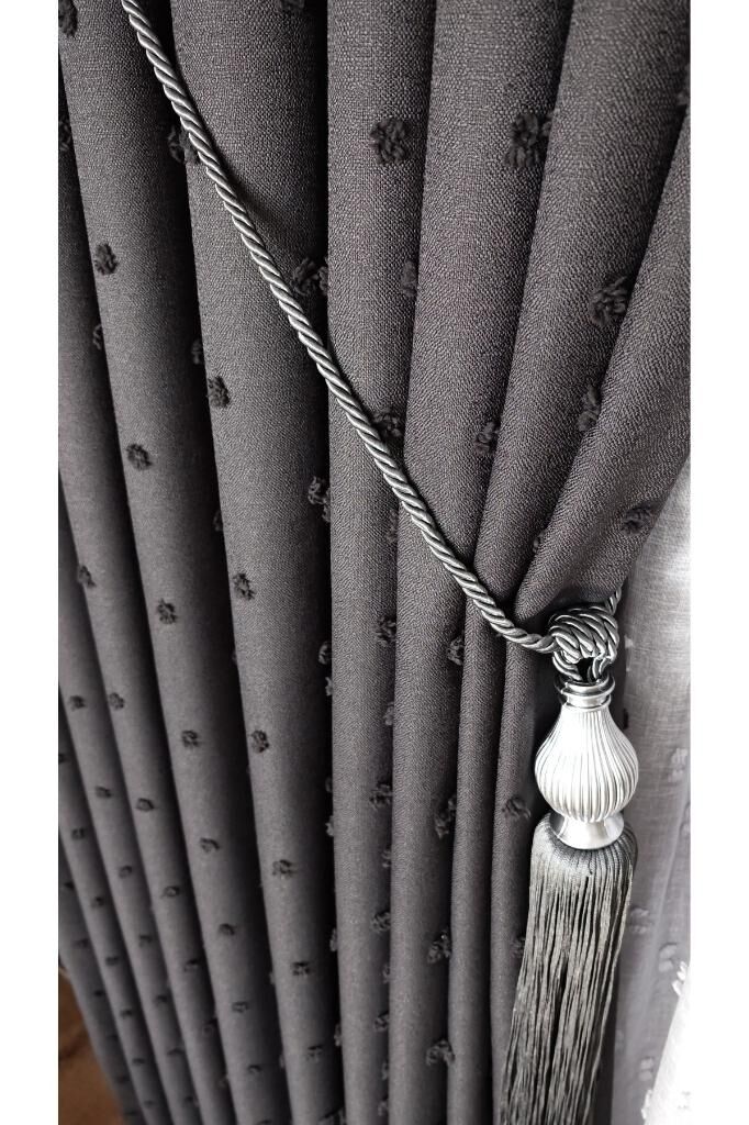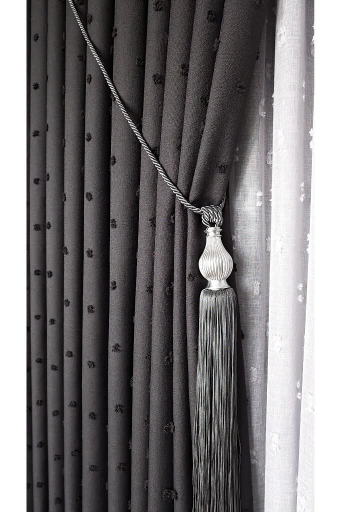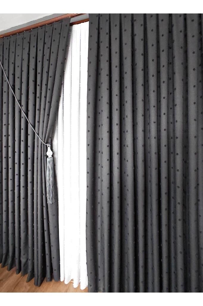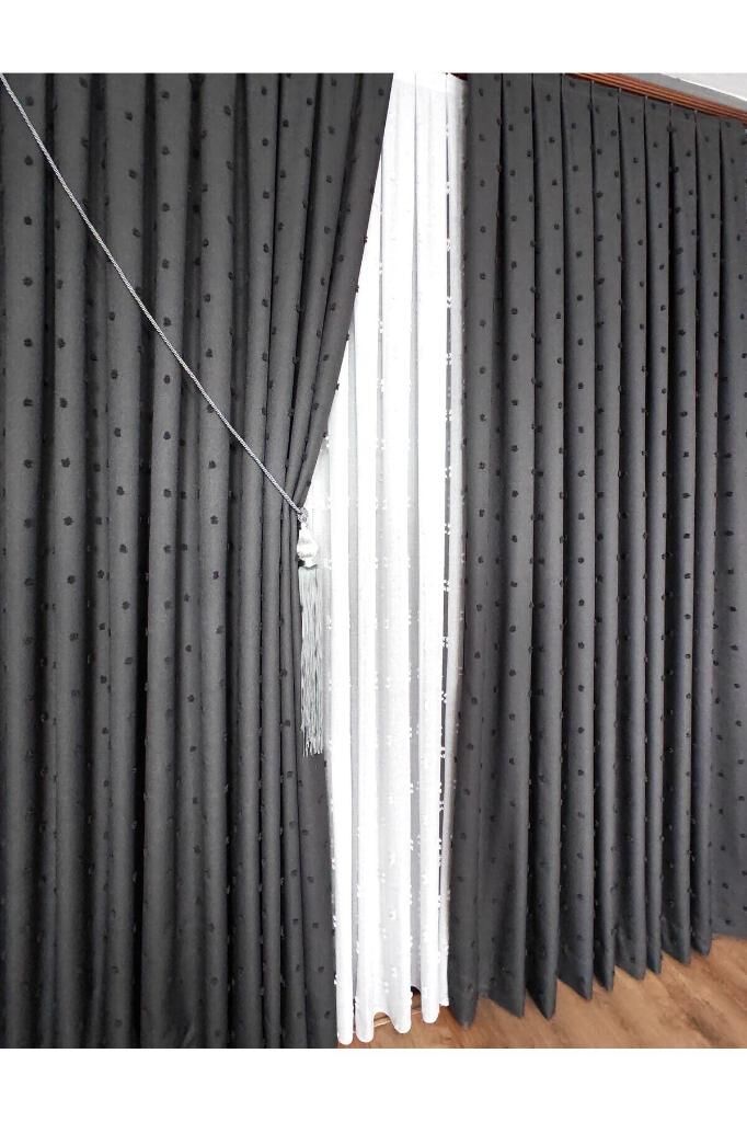 Keten Dokulu Ponponlu Krem Pano Fon Perde Lüks Ağır Gramajlı TEK KANAT 1/3 Sık Pileli Antrasit V-23 - 80 x 260