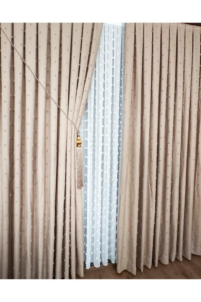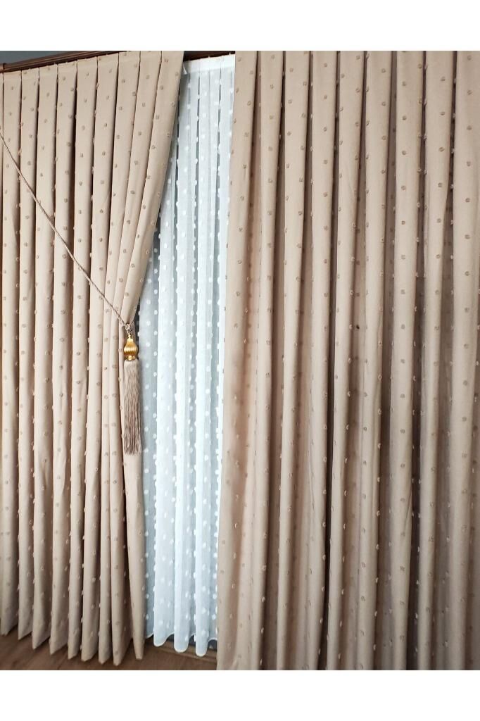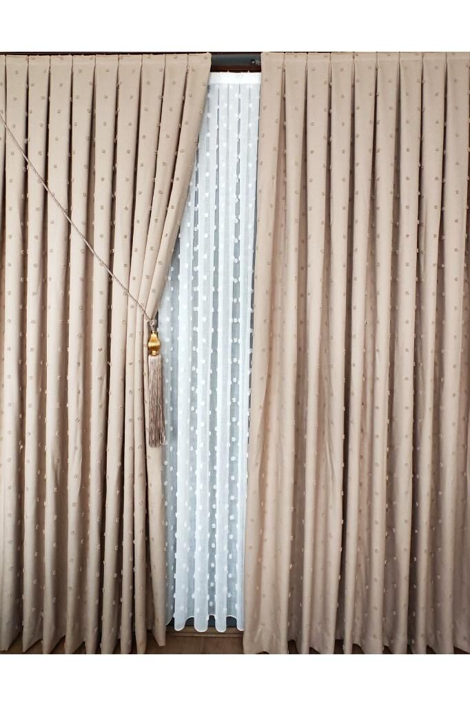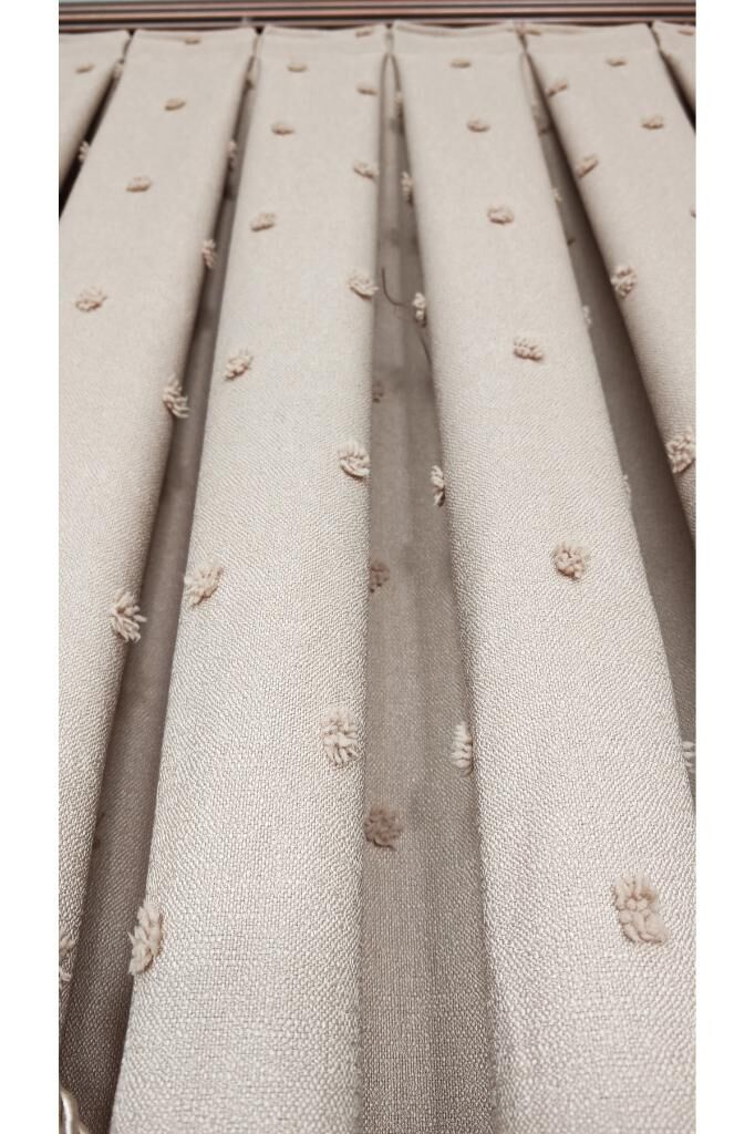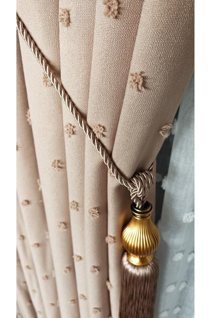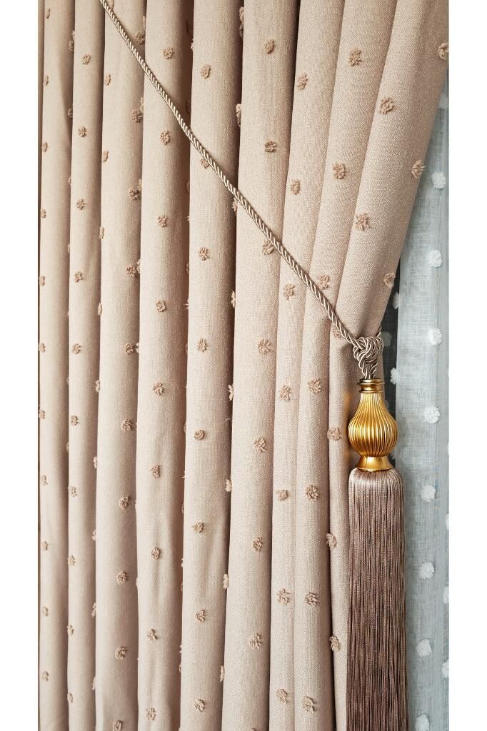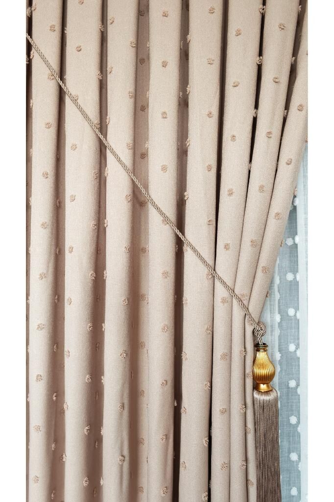 Keten Dokulu Ponponlu Krem Pano Fon Perde Lüks Ağır Gramajlı TEK KANAT 1/3 Sık Pileli Sütlü Kahve V-6 - 120 x 270