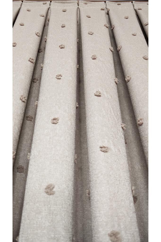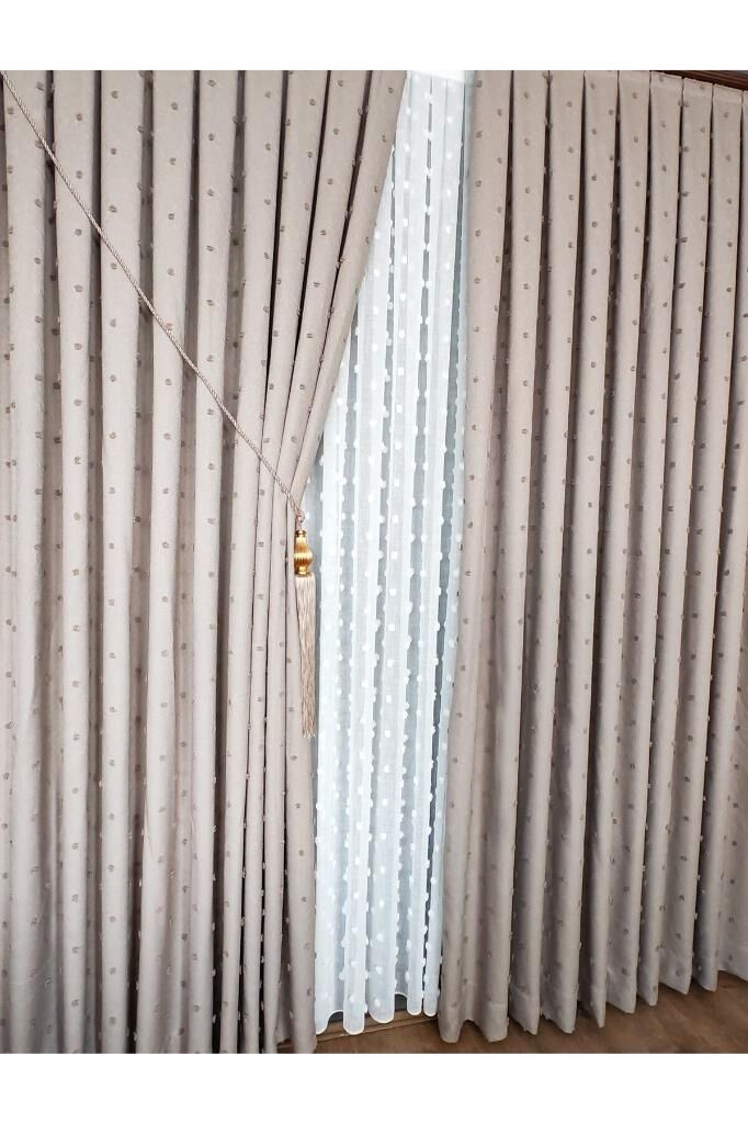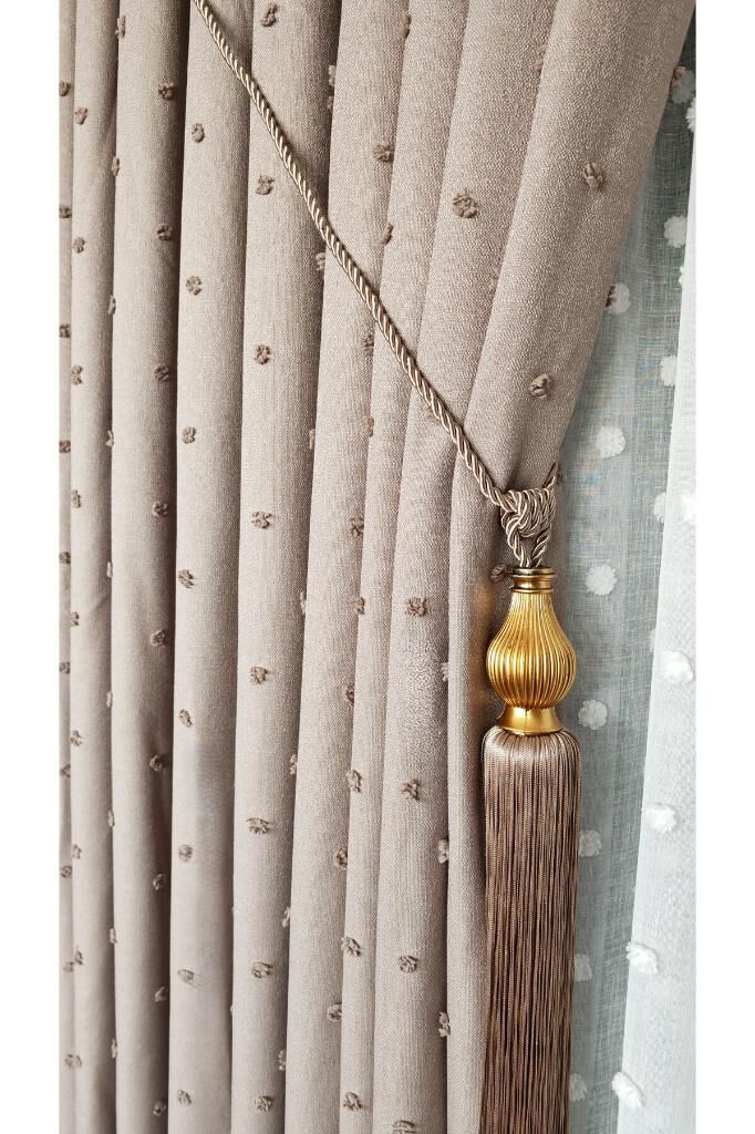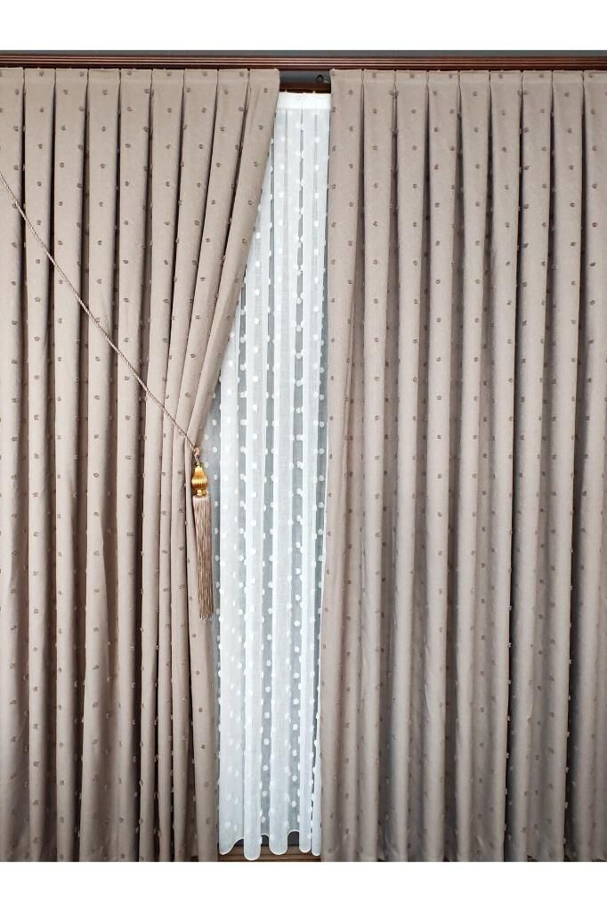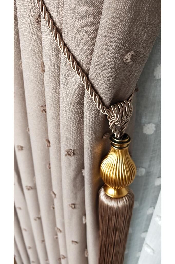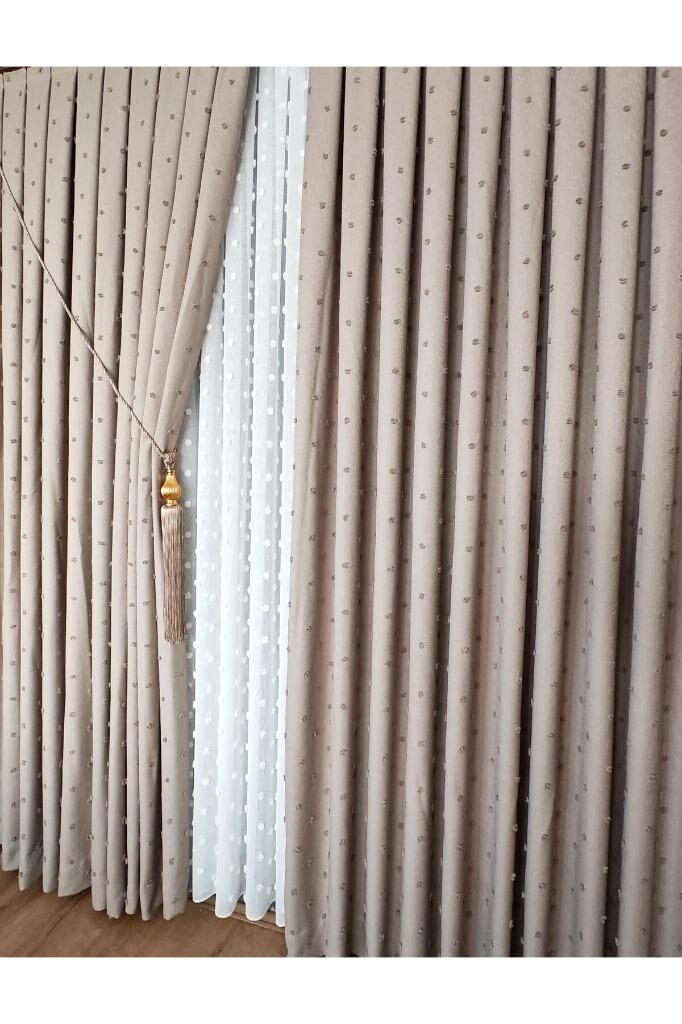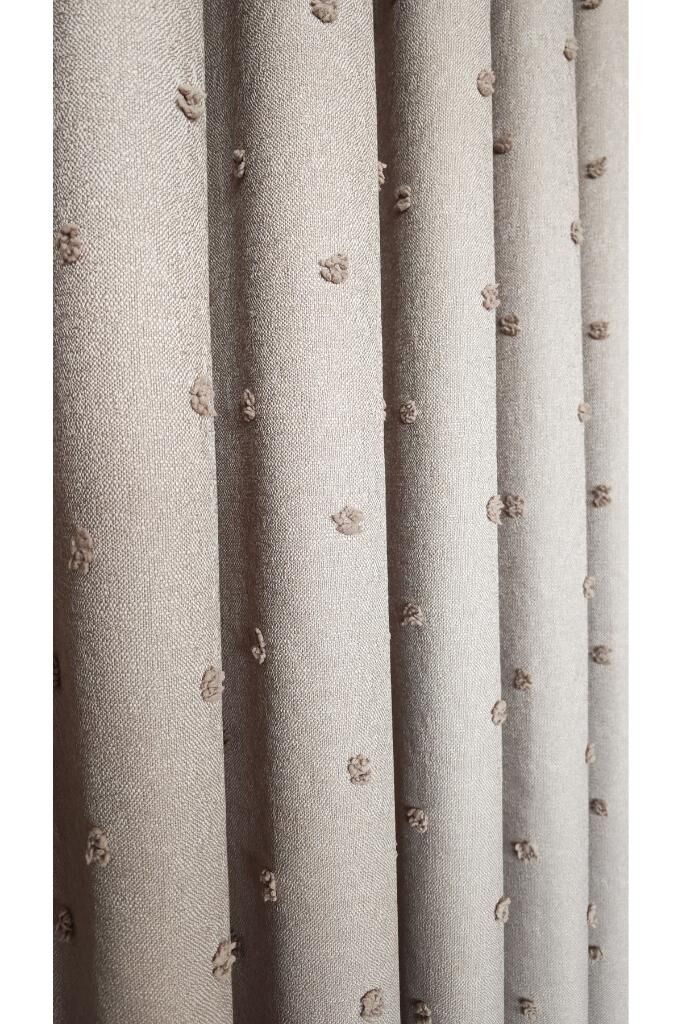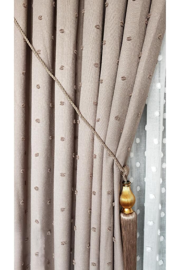Keten Dokulu Ponponlu Krem Pano Fon Perde Lüks Ağır Gramajlı TEK KANAT 1/3 Sık Pileli Vizon V-5 - 90 x 270